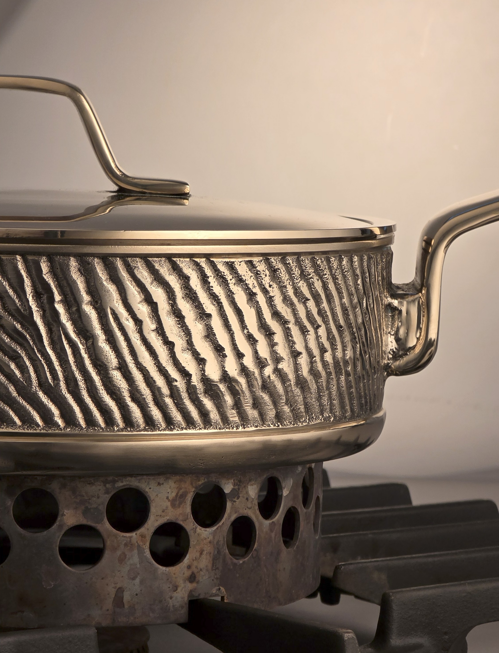 Indulge in the extraordinary. This is not merely cookware, but sculpture. The exterior of our pans feature wrought, sculptural lines set against molten polished ones. Evoking tensions between dark and light, ancient and modern. A visually appealing look that could only be achieved with a highly specialised casting process.